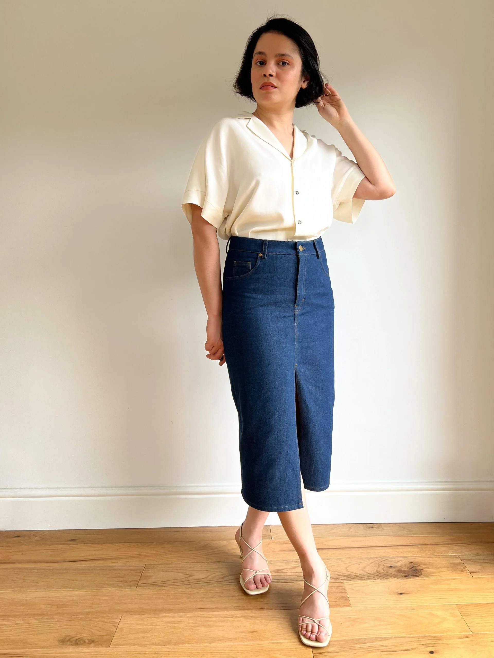 Buy the Anna Skirt sewing pattern from Bella Loves Patterns. Anna is a classic fitted, high-waisted, midi length denim skirt with a straight silhouette. The skirt has a zip fly, two curved pockets and a single coin pocket at the front, and a front slit. The back features a curved yoke, two patch pockets, and a centre seam. The waistband has five belt loops, and all the main seams have decorative topstitching.