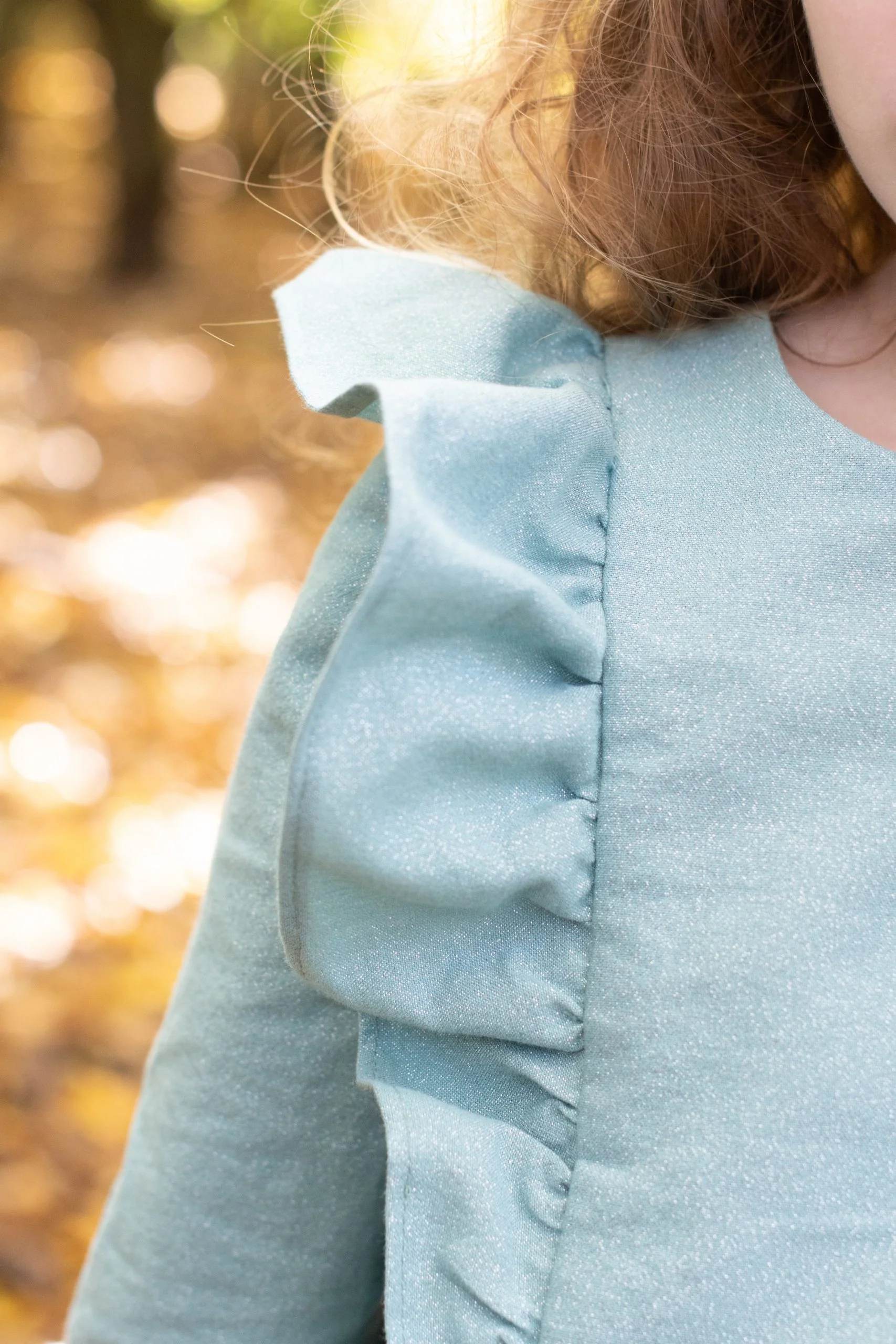 Buy the Baby/Child/Teen Alice Dress and Top sewing pattern from Bobbins and Buttons. Alice is a semi-fitted dress or top with a deep ruffle that runs over the shoulder. The dress has curved front seams with in-seam pockets and fastens with an invisible centre back zipper. The top has a keyhole back neck opening finished with a button and hand stitched loop. Both can be made with or without sleeves and ruffles.