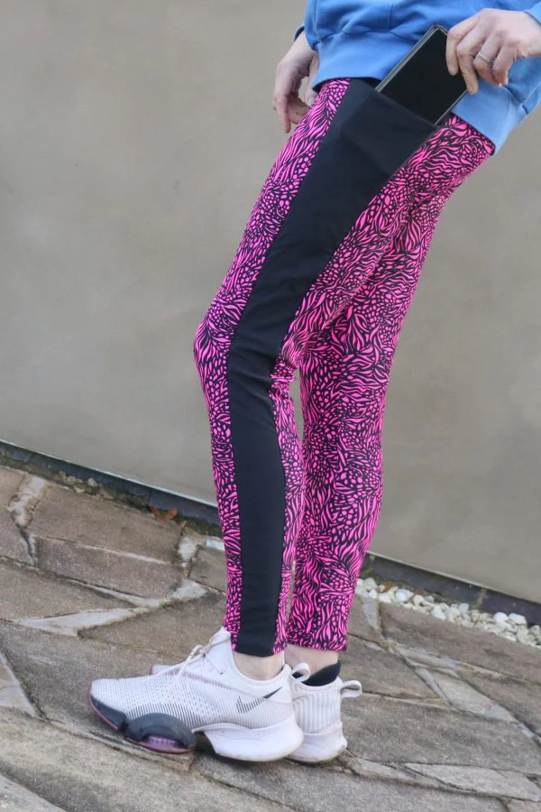 Buy the Violet Leggings sewing pattern from Bobbins and Buttons. Violet is a high-waisted, tight-fitting legging with a deep waistband. Choose a plain or panelled leg. There are three length options: full length, 7/8 or cropped. The pattern includes an optional phone or key-sized back waistband pocket and an optional phone pocket in the side panel.