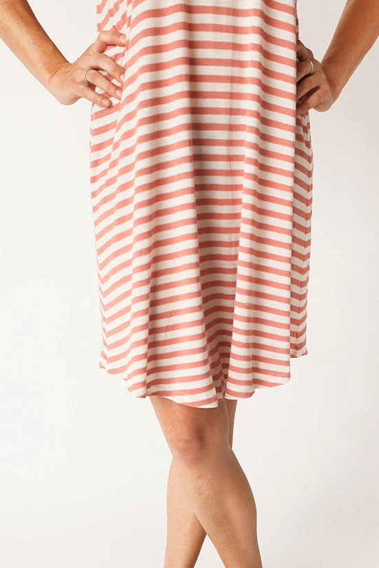 Buy the Pony Tank and Dress sewing pattern from Chalk and Notch. The Pony Tank is a swing shaped knit tank top or dress with a curved hem. There are three views: a cropped tank, a tank top, and a tank dress.