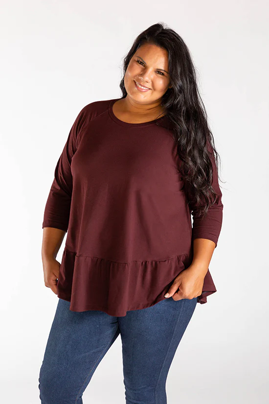 Buy the Waterfall Raglan Top and Dress sewing pattern from Chalk and Notch. The Waterfall Raglan is a swing shape knit top or dress. There are three views: a cropped top, a ruffle top, and a ruffle dress. The sleeve has a slim fit with three length options: short, 3/4, and long sleeve.