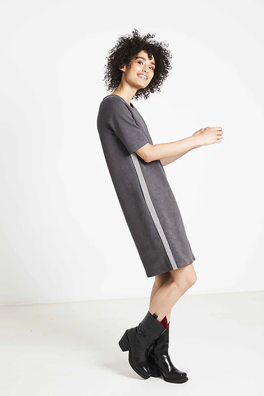 Buy the Toni Dress sewing pattern from Fibre Mood. Toni is a loose, straight dress that falls just above the knee and features half-length raglan sleeves, a round neckline and pockets in the side seams. This dress is elegant in its simplicity. Opt for a ribbon on the side seam for a more sporty look.