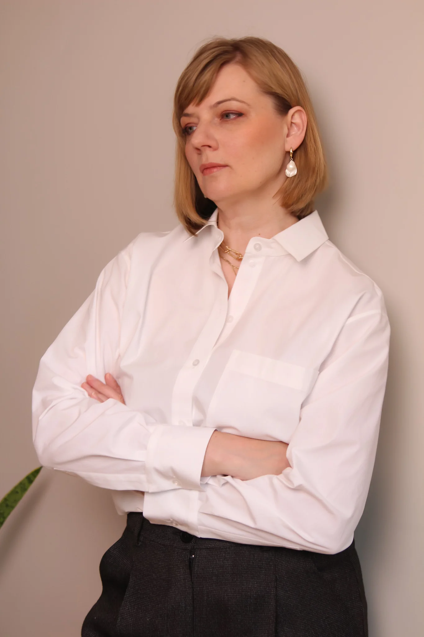 Buy the Artur Shirt sewing pattern from Lenaline Patterns. Artur is a loose-fitting, menswear-inspired shirt with a slightly lowered shoulder line, button front, and collar and collar stand. The long sleeves end in cuffs with a button placket. There is a patch pocket on the left front. Wear Artur with jeans, skinny jeans or a pencil skirt. This classic shirt will be one of your wardrobe staples.