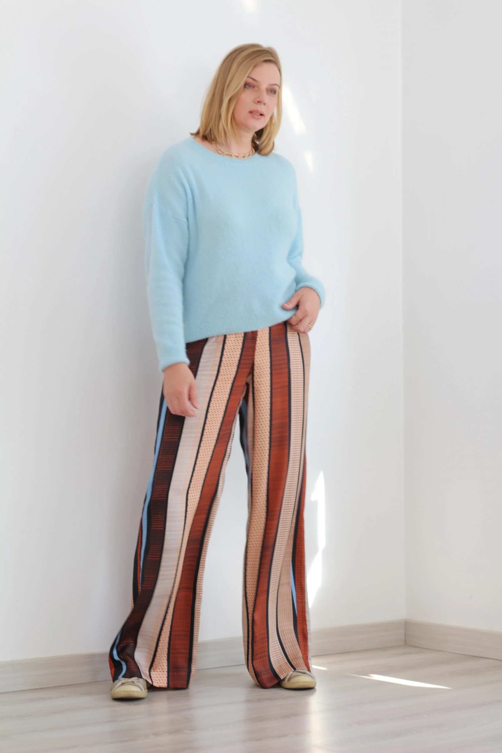 Buy the Vlad Trousers sewing pattern from Lenaline Patterns. These very comfortable trousers have a wide leg, elastic waist, and side seam pockets.