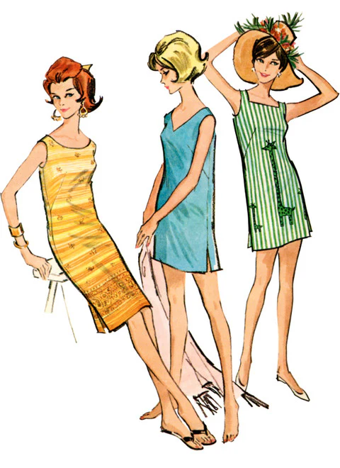 Buy the M8402 Vintage 1960's Dresses sewing pattern from McCalls. It’s perfect for an advanced beginner dressmaker. Vintage 1960's Sewing Pattern. Slim, sleeveless, pullover dress, consisting of two main pieces plus facings, in choice of two lengths. Dress has french darts at front, vents in side seams. Front neckline may be round, square or V-shape. Authentic Vintage Reproduction.