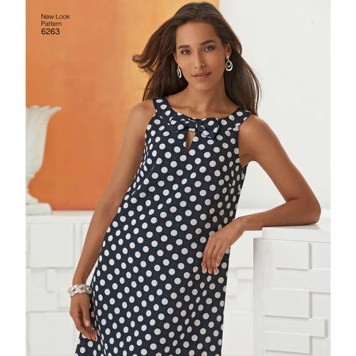 Buy the N6263 A-line dress sewing pattern from New Look. It’s perfect for an advanced beginner dressmaker. Misses’ sleeveless A-line dress features a notched neck line with and without a bow. View C can be made without notch and long bow or view D can be made with a contrast band.