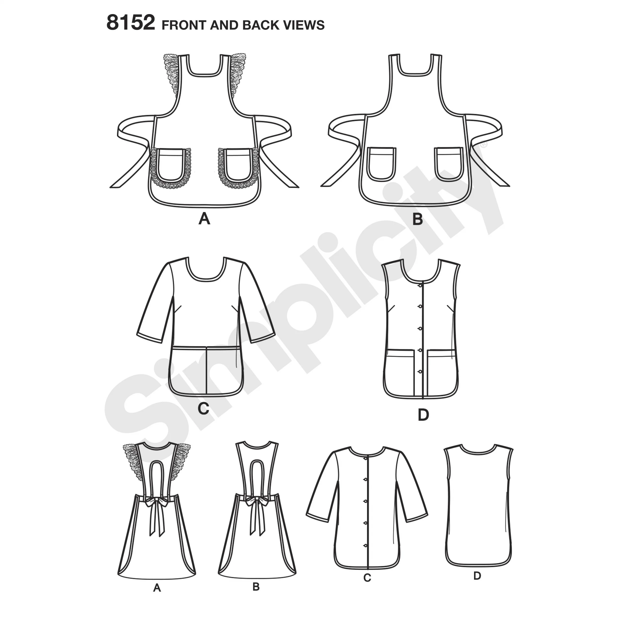 Buy the S8152 vintage 1970's aprons sewing pattern from Simplicity. It’s perfect for a beginner dressmaker. Misses’ vintage aprons from the 1970’s includes traditional shaped apron with pockets and optional ruffled lace trim, or smock style apron with or without half sleeves.
