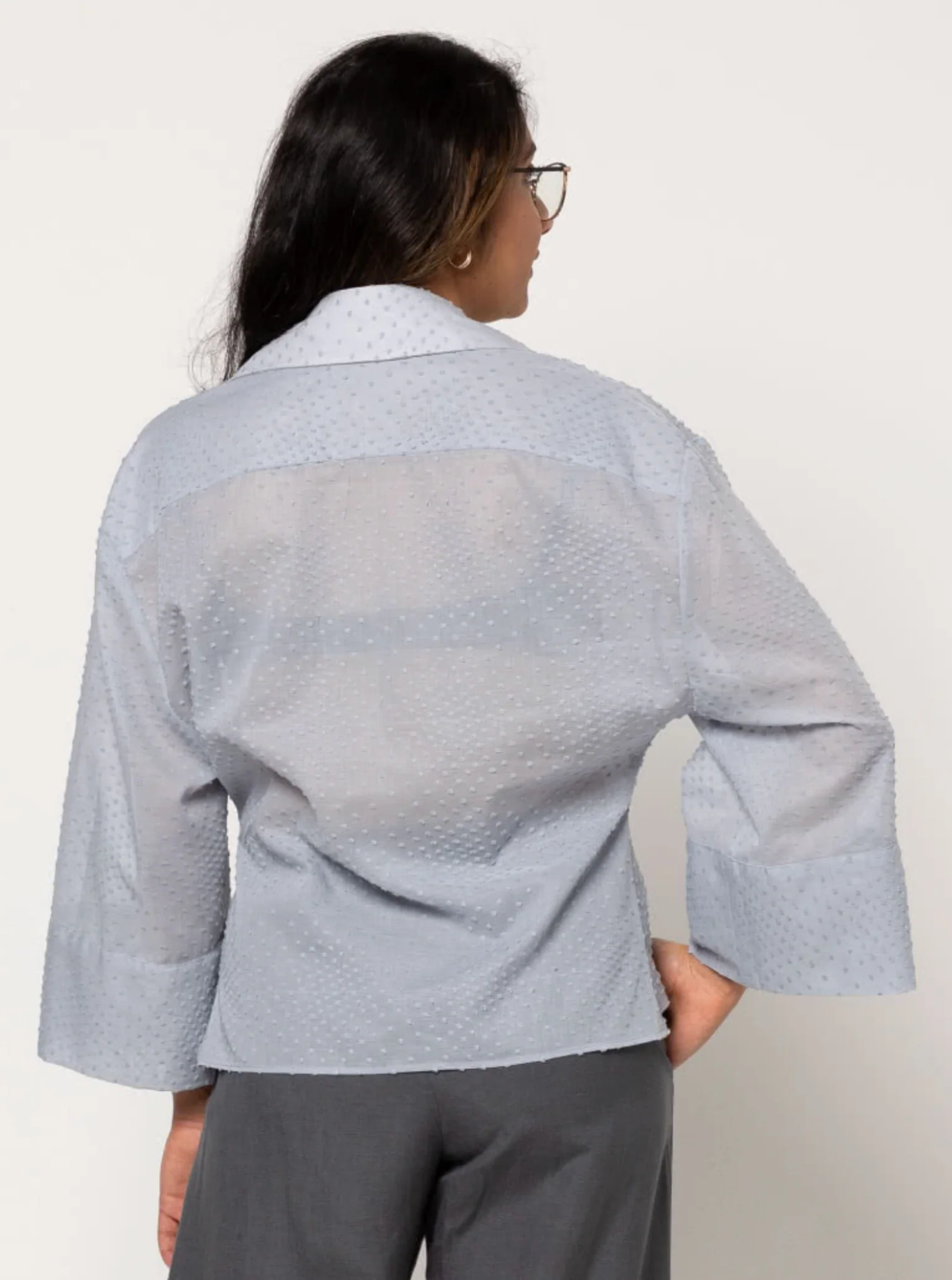 Buy the Nicola Woven Shirt sewing pattern from Style Arc. This button-front blouse features a faux tie, lower front tucks, double yoke, two-piece collar, slightly dropped shoulders, and wide 7/8-length cuffed sleeves.
