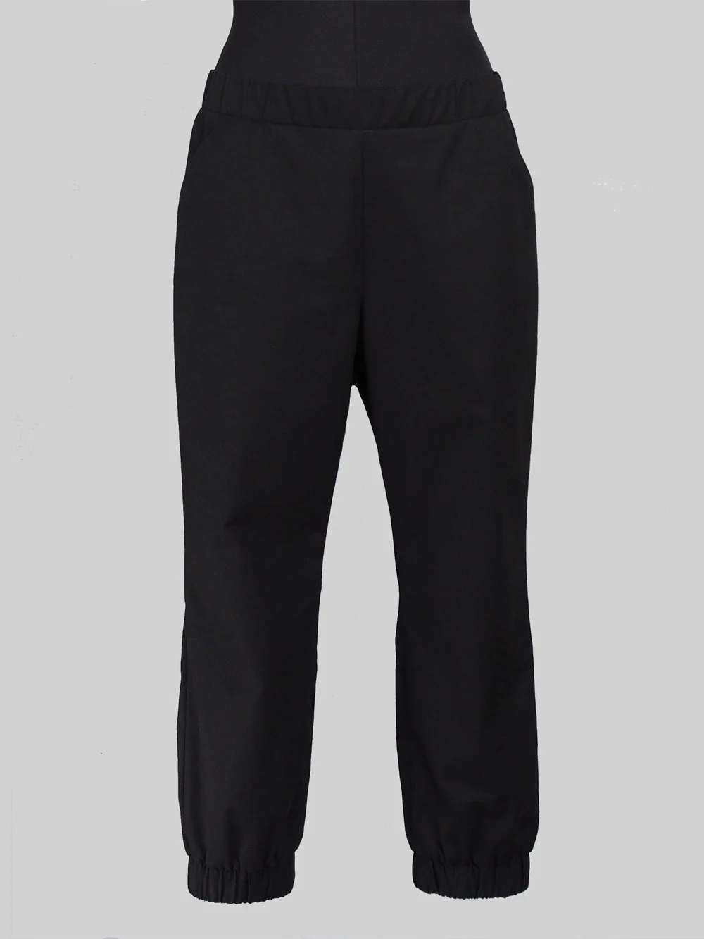 Buy the Almost Long Trousers sewing pattern from The Assembly Line. These pants have a relaxed fit, low waist, dropped crotch, and in-seam pockets. The leg tapers to the ankle. The waistband and bottom cuffs are elasticated.
